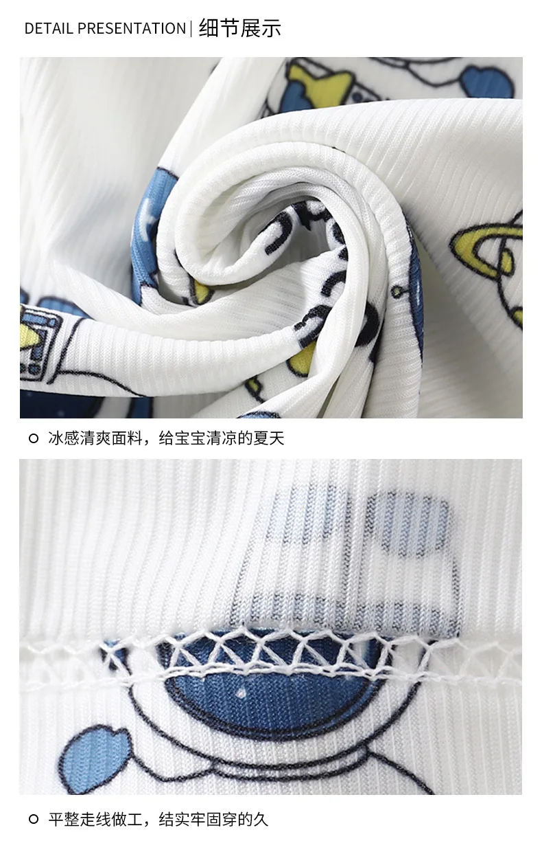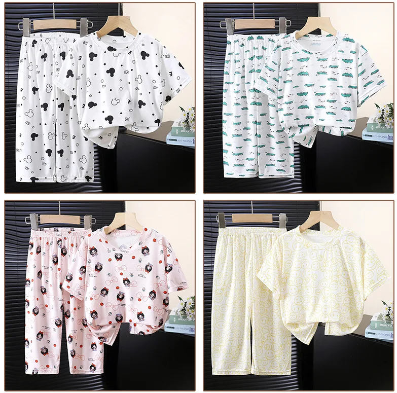 Children’s Summer Thin Breathable Pajamas Short Sleeve Cartoon Print Ice Silk Clothing Set Sleepwear Boys Girls Casual Homewear